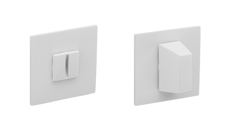 Zestaw klamek ze stali nierdzewnej na rozetach kwadratowych o grubości 2mm. Łatwy montaż na adapter wewnętrzny na tak zwany „klik”. Podwójny system sprężyn poziomujących rękojeści, zespolony z rozetą podklamkową. Kwadratowy trzpień 8×100 mm. Montaż na dwie śruby M6, niewidoczne po zamontowaniu., kolor 152