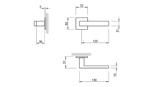 Zestaw klamek na rozetach kwadratowych o grubości 5mm. Łatwy montaż na adapter wewnętrzny na tak zwany „klik”. Podwójny system sprężyn poziomujących rękojeści, zespolony z rozetą podklamkową. Kwadratowy trzpień 8×100 mm. Montaż na dwie śruby M6, niewidoczne po zamontowaniu. kolor 153