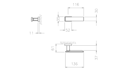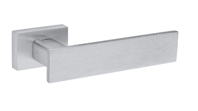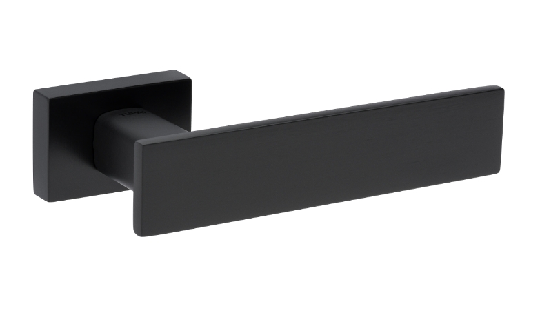 Zestaw klamek na rozetach prostokątnych 5mm o szer. 52mm. Łatwy montaż na adapterze metalowym na tak zwany „klik”. Podwójny system sprężyn poziomujących rękojeści. Kwadratowy trzpień 8×100 mm. Montaż na dwie śruby M6, niewidoczne po zamontowaniu. kolor 153