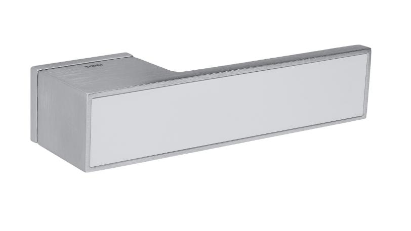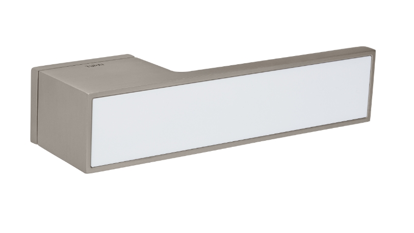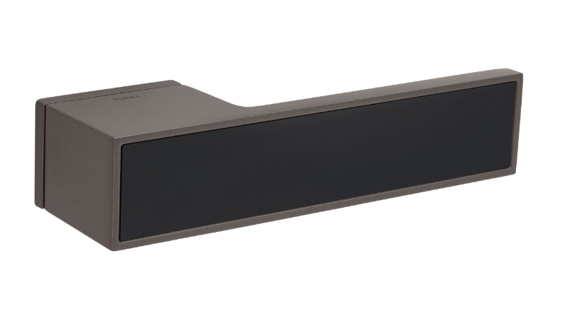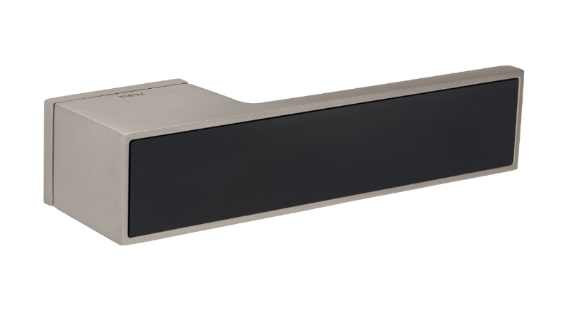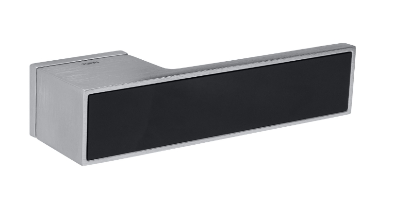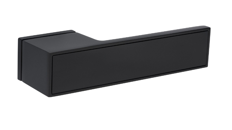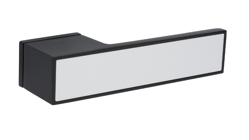 Zestaw klamek na rozetach prostokątnych 5mm o szer. 52mm. Łatwy montaż na adapterze metalowym na tak zwany „klik”. Podwójny system sprężyn poziomujących rękojeści. Kwadratowy trzpień 8×100 mm. Montaż na dwie śruby M6, niewidoczne po zamontowaniu. Model z czarną wstawką dekoracyjną w komplecie. kolor 96