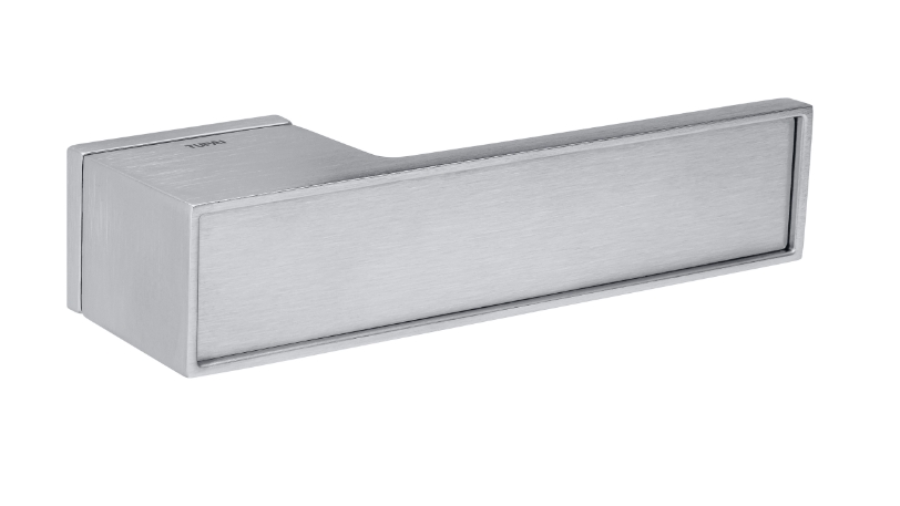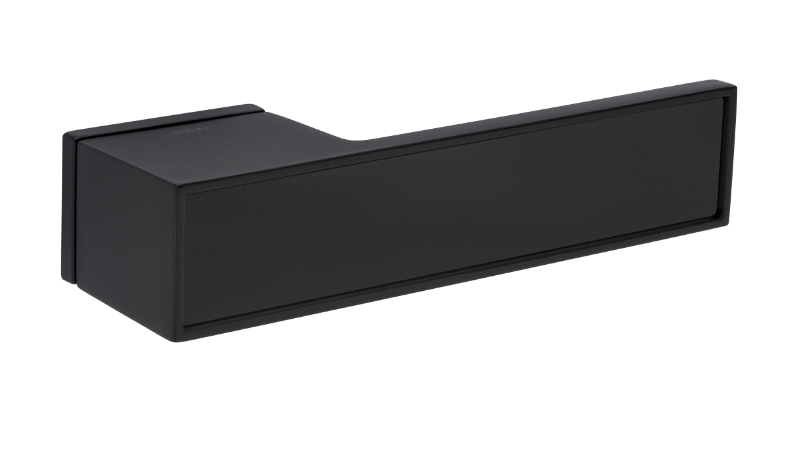 Zestaw klamek na rozetach prostokątnych 5mm o szer. 52mm. Łatwy montaż na adapterze metalowym na tak zwany „klik”. Podwójny system sprężyn poziomujących rękojeści. Kwadratowy trzpień 8×100 mm. Montaż na dwie śruby M6, niewidoczne po zamontowaniu. Model bez wstawki dekoracyjnej do samodzielnej aranżacji. kolor 96