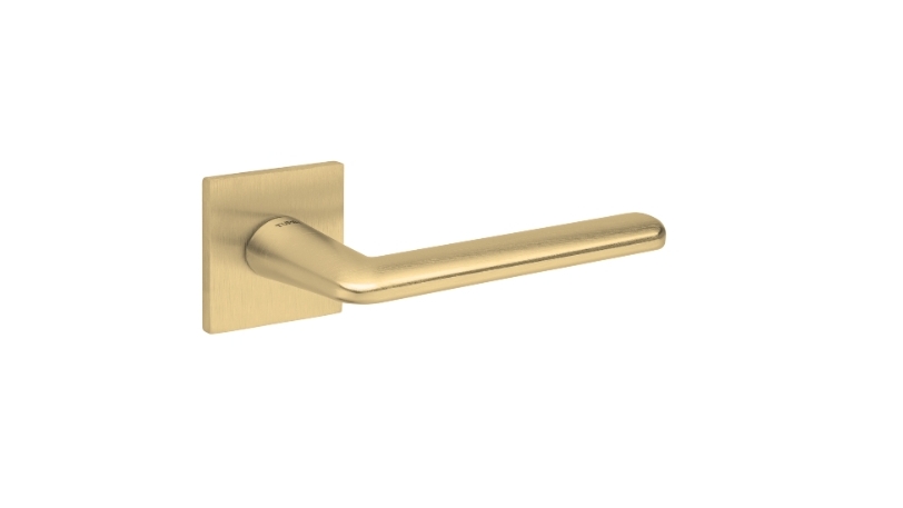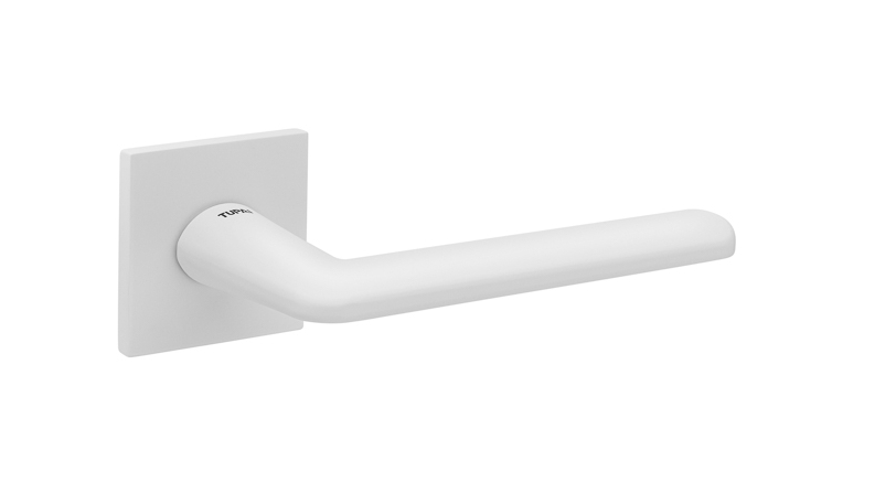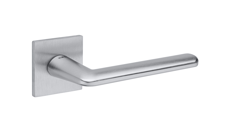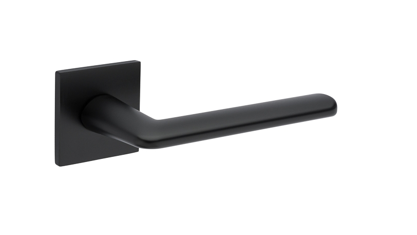 Zestaw klamek na rozetach kwadratowych o grubości 5mm. Łatwy montaż na adapter wewnętrzny na tak zwany „klik”. Podwójny system sprężyn poziomujących rękojeści, zespolony z rozetą podklamkową. Kwadratowy trzpień 8×100 mm. Montaż na dwie śruby M6, niewidoczne po zamontowaniu.