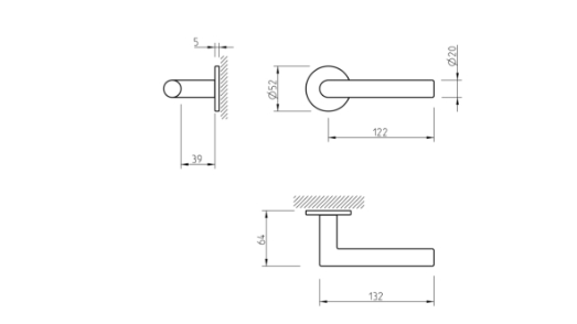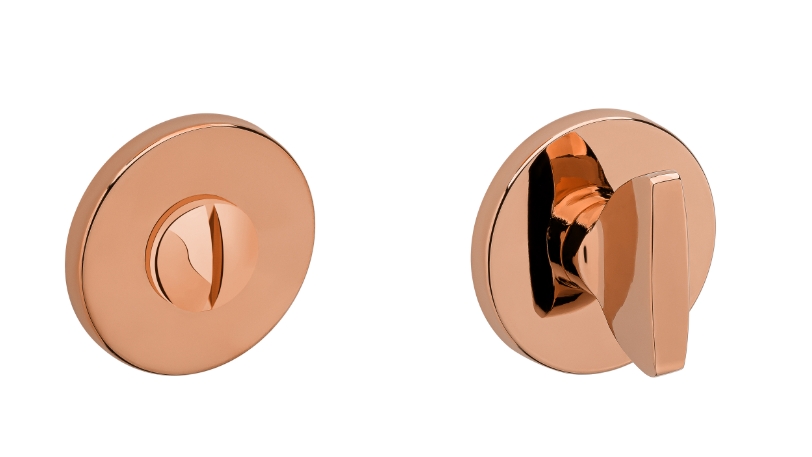 Zestaw klamek na rozetach okrągłych o grubości 5mm. Łatwy montaż na adapter wewnętrzny na tak zwany „klik”. Podwójny system sprężyn poziomujących rękojeści, zespolony z rozetą podklamkową. Kwadratowy trzpień 8×100 mm. Montaż na dwie śruby M6, niewidoczne po zamontowaniu.