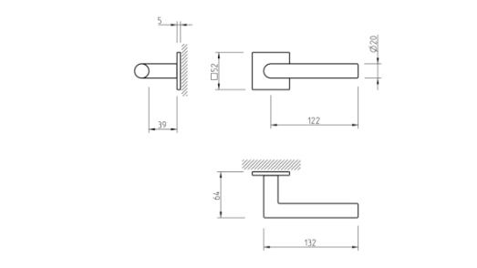 Zestaw klamek na rozetach kwadratowych o grubości 5mm. Łatwy montaż na adapter wewnętrzny na tak zwany „klik”. Podwójny system sprężyn poziomujących rękojeści, zespolony z rozetą podklamkową. Kwadratowy trzpień 8×100 mm. Montaż na dwie śruby M6, niewidoczne po zamontowaniu.