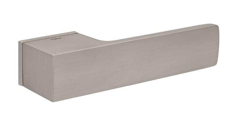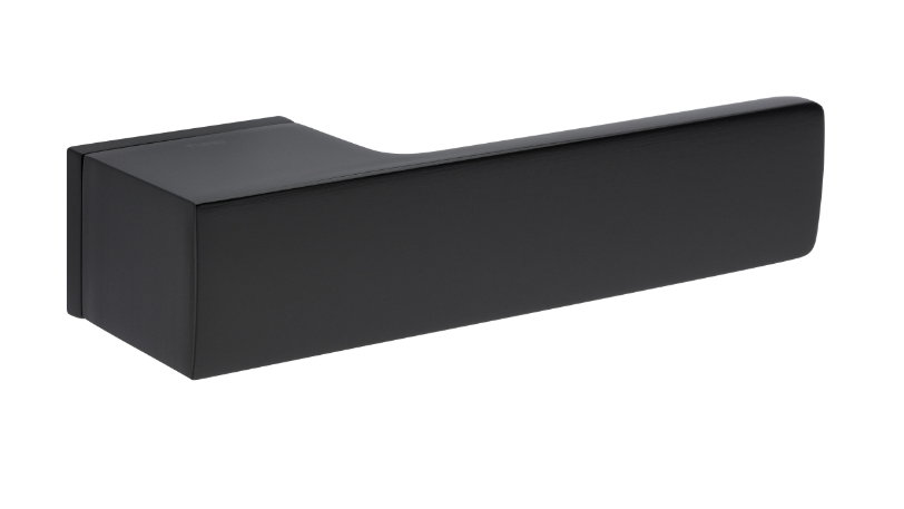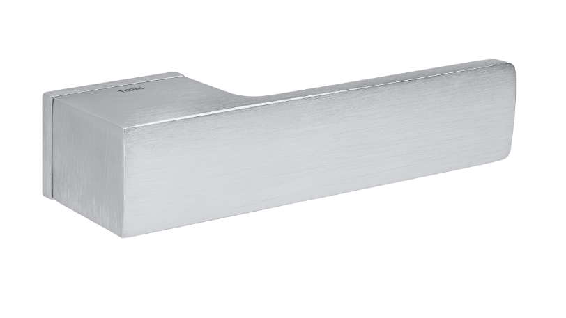 Zestaw klamek na rozetach prostokątnych 5mm o szer. 52mm. Łatwy montaż na adapterze metalowym na tak zwany „klik”. Podwójny system sprężyn poziomujących rękojeści. Kwadratowy trzpień 8×100 mm. Montaż na dwie śruby M6, niewidoczne po zamontowaniu.