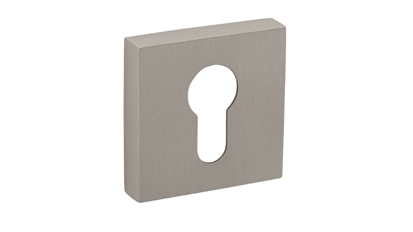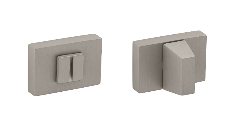 Zestaw klamek na rozetach prostokątnych 5mm o szer. 52mm. Łatwy montaż na adapterze metalowym na tak zwany „klik”. Podwójny system sprężyn poziomujących rękojeści. Kwadratowy trzpień 8×100 mm. Montaż na dwie śruby M6, niewidoczne po zamontowaniu.