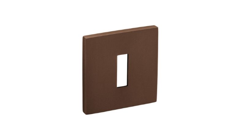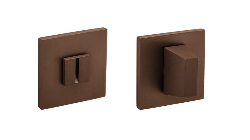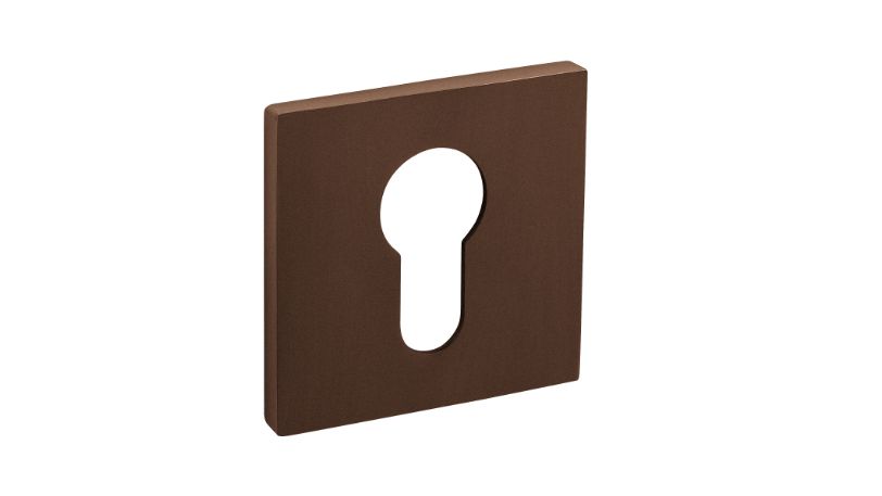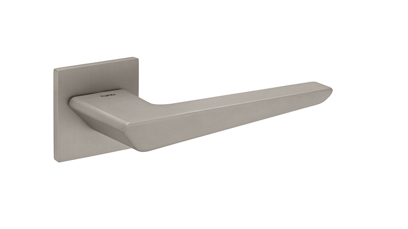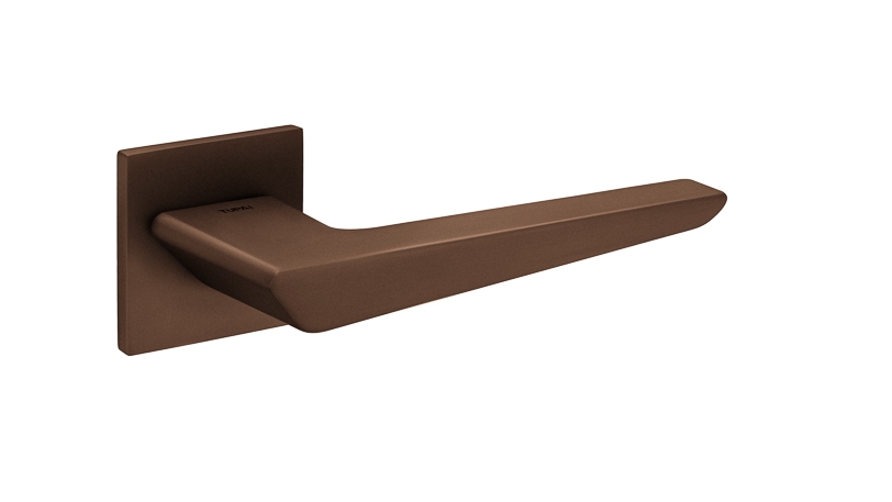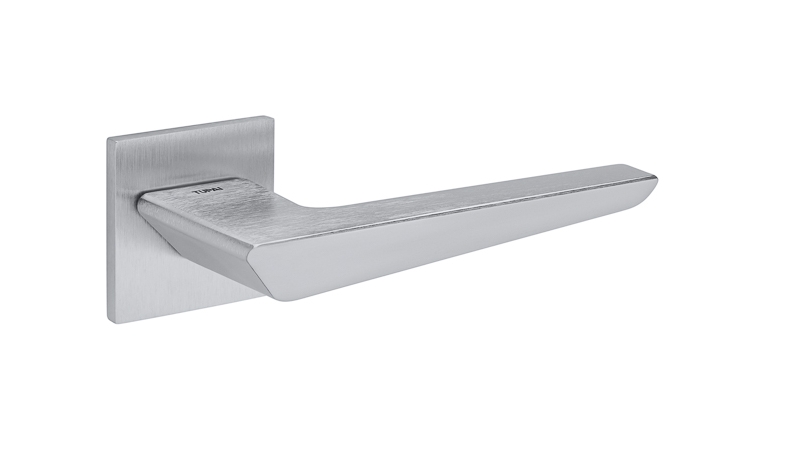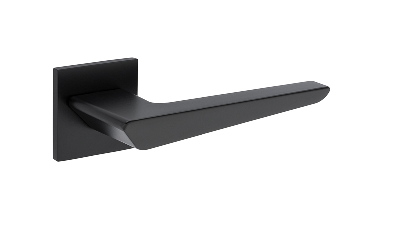 Zestaw klamek na rozetach kwadratowych o grubości 5mm. Łatwy montaż na adapter wewnętrzny na tak zwany „klik”. Podwójny system sprężyn poziomujących rękojeści, zespolony z rozetą podklamkową. Kwadratowy trzpień 8×100 mm. Montaż na dwie śruby M6, niewidoczne po zamontowaniu.