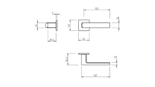 Zestaw klamek na rozetach kwadratowych o grubości 5mm. Łatwy montaż na adapter wewnętrzny na tak zwany „klik”. Podwójny system sprężyn poziomujących rękojeści, zespolony z rozetą podklamkową. Kwadratowy trzpień 8×100 mm. Montaż na dwie śruby M6, niewidoczne po zamontowaniu.