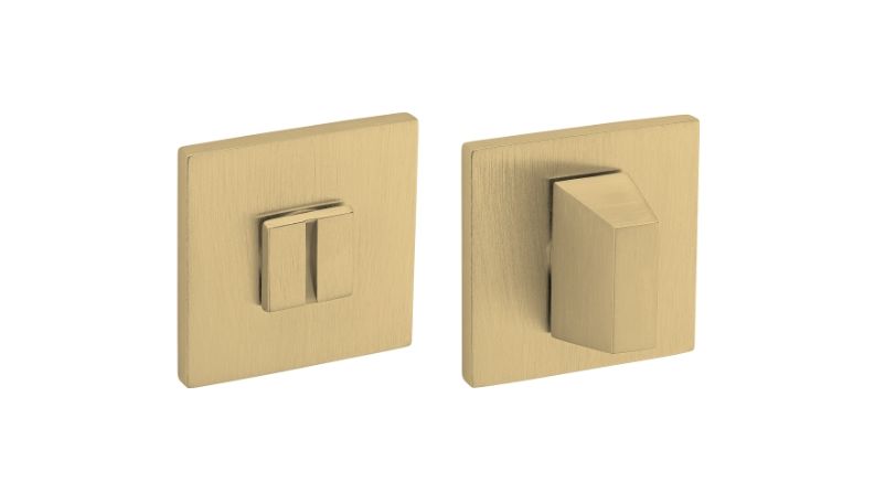 Zestaw rozet do drzwi łazienkowych na szyldach kwadratowych 52mm o grubości 5mm. Możliwość awaryjnego otwierania z zewnątrz. Trzpień kwadratowy 4×4 mm. kolor 186