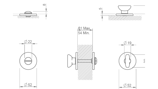 Zestaw rozet do drzwi łazienkowych na szyldach okrągłych Ø52mm o grubości 5mm. Możliwość awaryjnego otwierania z zewnątrz. Trzpień kwadratowy 4x4mm.